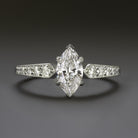 This vintage inspired ring has a sophisticated design featuring a 0.74ct marquise shape diamond paired with diamond studded shoulders!
